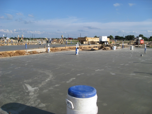 A housing development or commercial construction site. There are grey footprints on the darker grey asphalt, and places for new electricity and plumbing. It is a sunny day with some clouds, and there is a water cooler in the foreground.