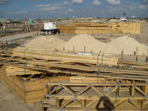 of wooden planks in the foreground, a piA building construction zone with lots le of sand in the middle, and then more wooden planks in the back. The environs appear to be arid and desert like. There are lots of pole like structures in the distance