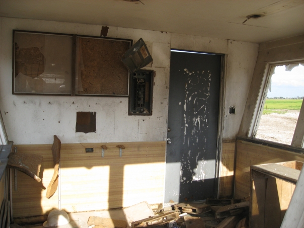 A room appears to be in disrepair with wood all over the floor and windows boarded up.