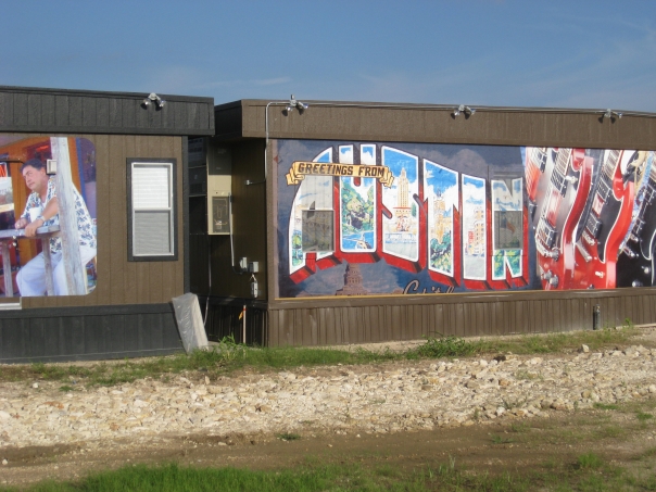 This is the hording painted in a wall conveys the greetings from austin with the guitars