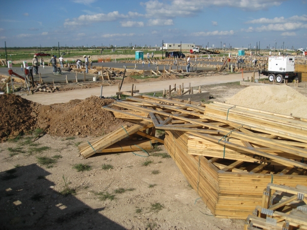 A new housing development is being built and construction workers have just finished laying the foundations of all the new homes.