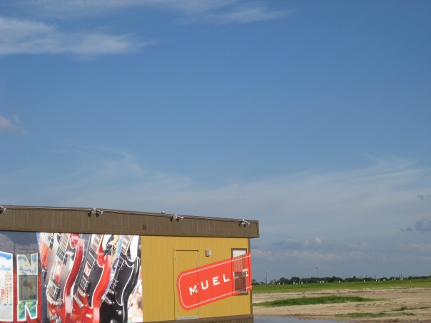 A brown trailer, covered in images of guitars and designs, sits in an empty lot of land.