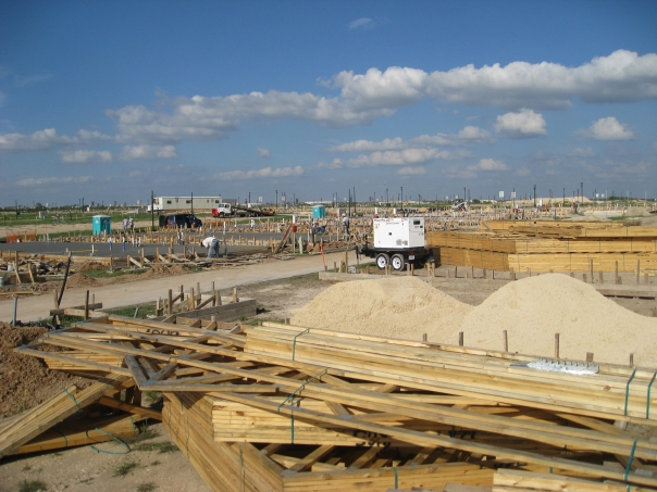 Piles of lumber to frame houses are stacked on several lots in a new housing development.