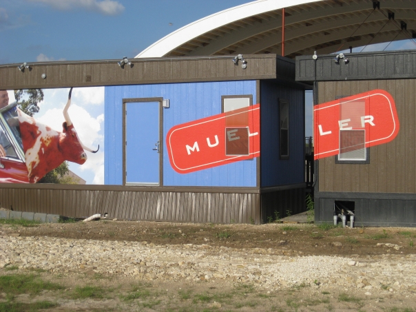 Two portable buildings sit side by side, decorated with an image of a red cow and a red logo.
