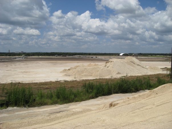 The view of a sand pile on a summer day with clouds in the sky.