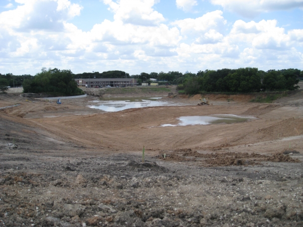 With a low-lying building in the background, a large excavated depression in the ground is partly filled with rainfall.