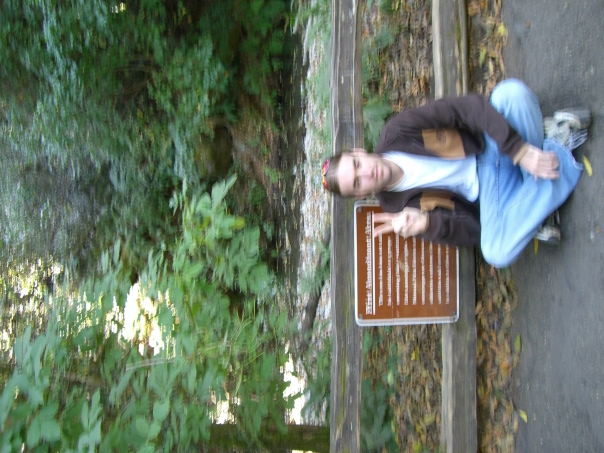 Young man sitting in front of park sign in woods.