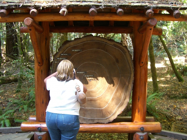 Tourist taking a picture of tree rings. The marked rings represent growth of the tree.