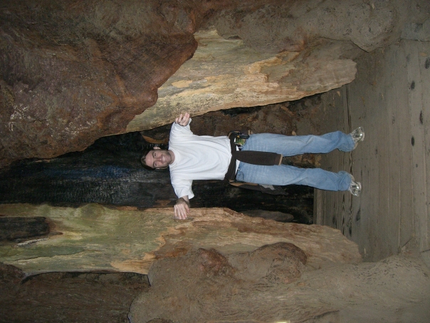 A happy younger man is touring these old caves.