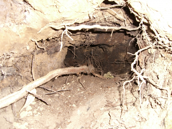 nice photo of the hole either a tree came out of or someone has dug maybe even a den of some sort