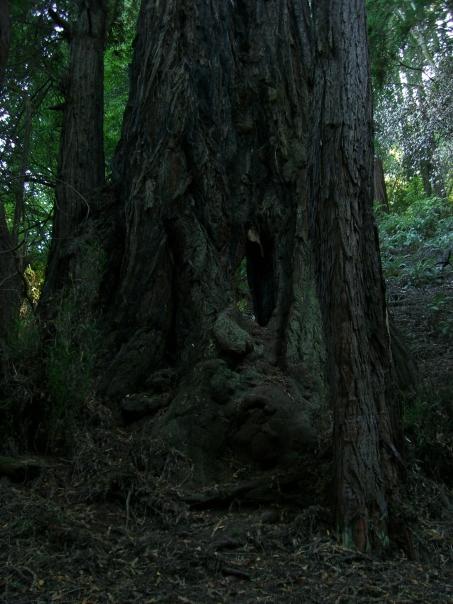 Close up view of large, gnarled tree trunk base.