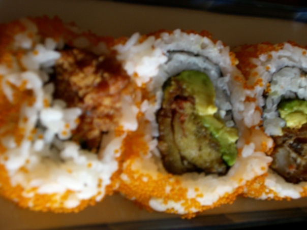 The sushi is covered with eel sauce and is stuffed with avocado.