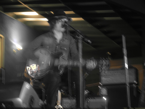 There is a guy wearing a hat, sitting down playing a guitar and singing. |