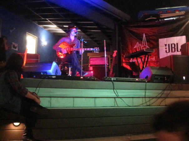 A guitarist performing his play during a contest in front of public and judges. |