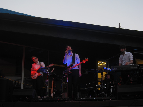 A music band consisting of four members playing a music concert outdoors on a cloudy day. |