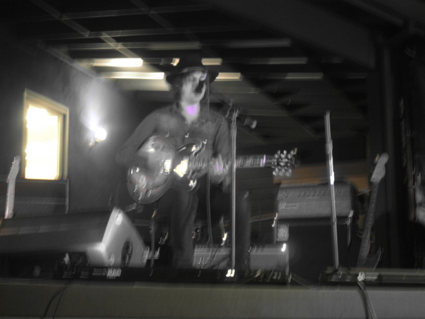 the man playing gittar in the recording room.i think he is doing his regarsal |