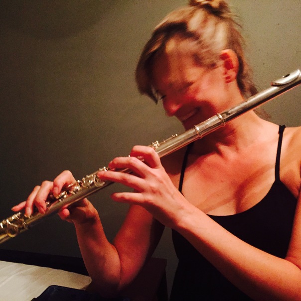 The smiling flutist in the black camisole and golden brown ponytail looked at her music sheet before playing her flute.