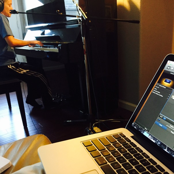 Boy in background wearing headphones plays keyboard while other person behind camera edits the audio on a Macbook computer.