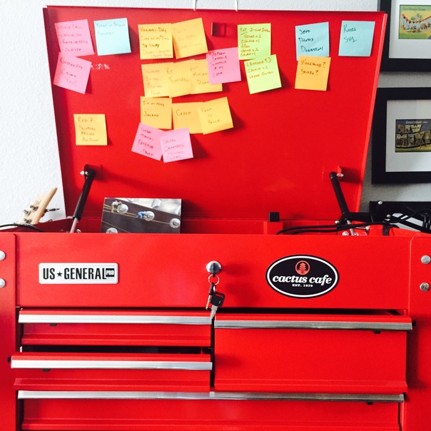 This is a red toolbox with multi-colored post-it notes on the inside of the lid.