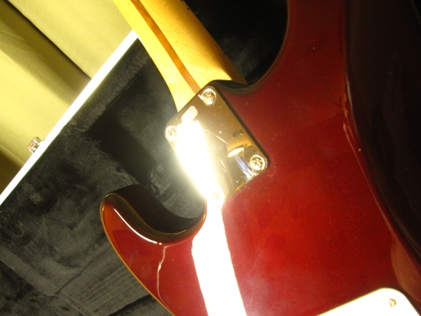 Light shines off a shiny piece of metal that is attached to a guitar.