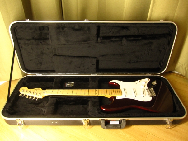 This is a beautiful electric guitar, tucked away safe in a guitar case.