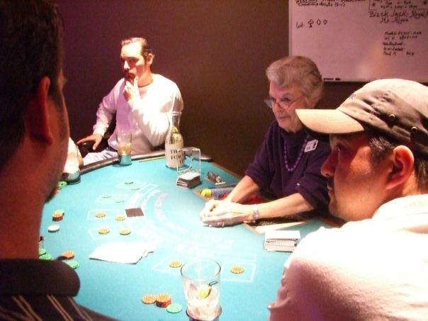 An older woman in a purple shirt and purple necklace acts as a dealer in this poker game.