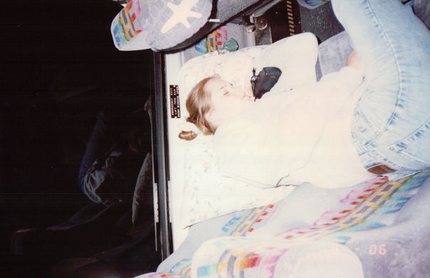 One lady with a brown ponytail is sleeping on an older looking couch.