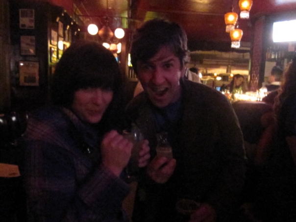 Pleasantly surprised couple enjoying mixed drinks on a cold night at the local pub.