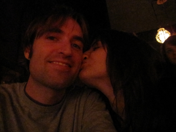 a cute woman kisses a handsome man on the cheek as he gazes at the camera.