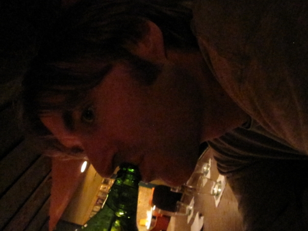 Shaggy-haired young man taking a swig of beer from a green glass bottle, staring into the middle distance.