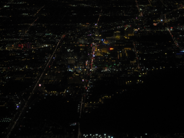 This picture is a plane or bird's eye view of some city at night depicting pitch-dark skies highlighted by numerous colored lights and protruding edges of tall buildings.