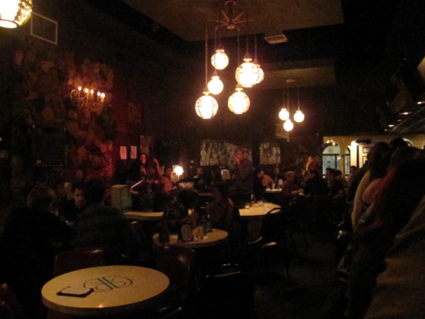 The mood-setting lighting illuminated a moderate number of casually dressed bar patrons.