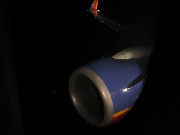 Illuminated by airport lights, parts of the Southwest plane can be observed by curious passengers and crew.