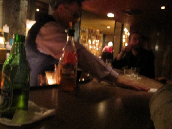 Bartender preparing to serve patrons a drink at night in a lit bar area.