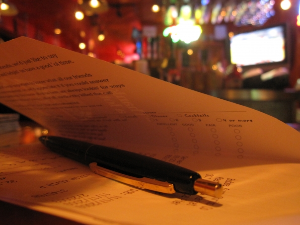 This picture shows a black pen inside a folded survey form with a receipt in a colorfully lit bar.