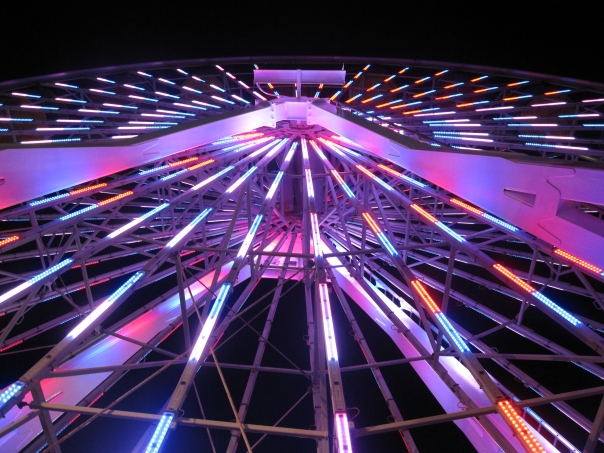 THE RIDE HAS BRIGHT BLUE, RED AND WHITE LED LIGHTS ON EACH BAR OF IT MAKING IT VERY NOTICEABLE.