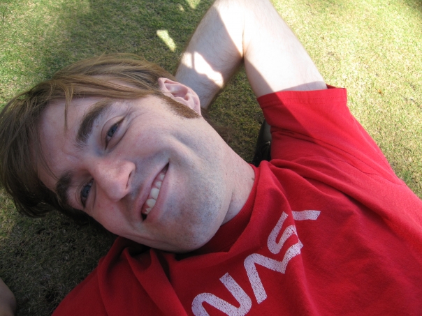 There is a man wearing a red shirt smiling and lying down on the grass.