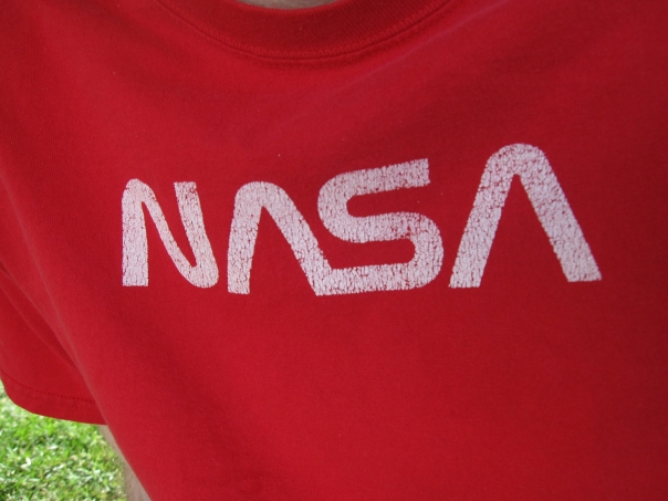 we can see a word like nasa is written on the t-shirt of a boy