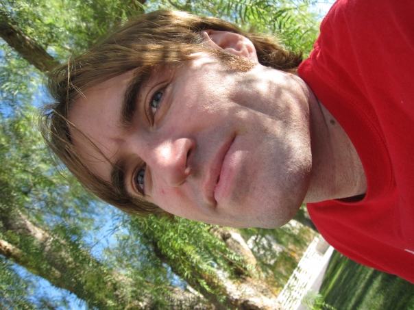 The man is wearing a red shirt and has brown shaggy hair and bushy eyebrows.