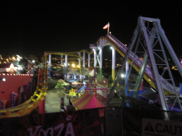 nighttime view of a roller coaster at a fair.