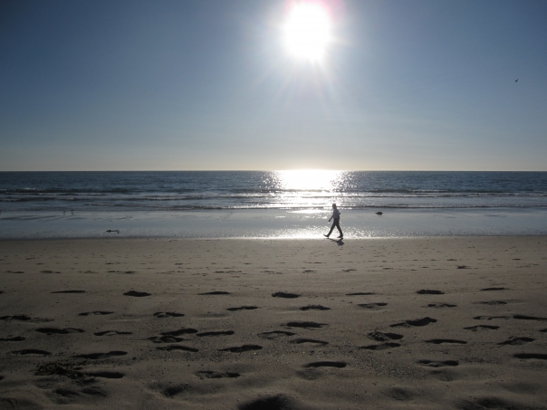 A person takes a walk on the beach at low tide on a sunny day