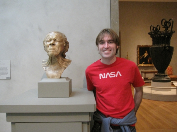 The man with the red shirt with "Nasa" written across his chest stood by the statue.