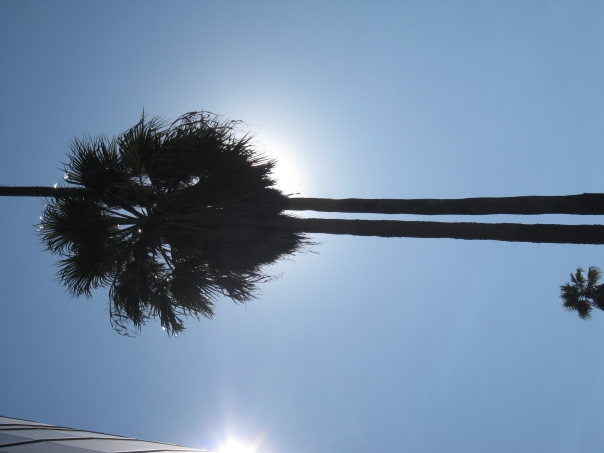 A palm tree on the sunny boardwalk and the sun shing brightly.