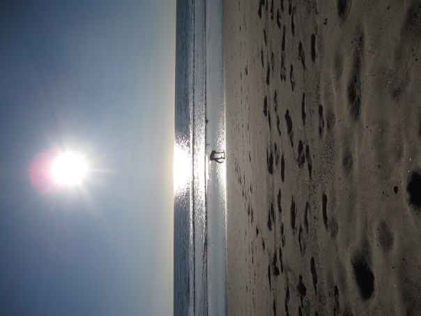A woman collecting seashells on a beautiful Sunday afternoon at the beach.