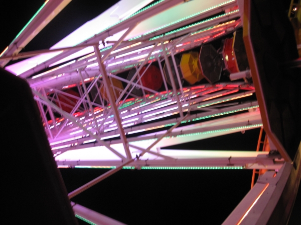 Lights and steel beams shine on the inside of an amusement park ride.