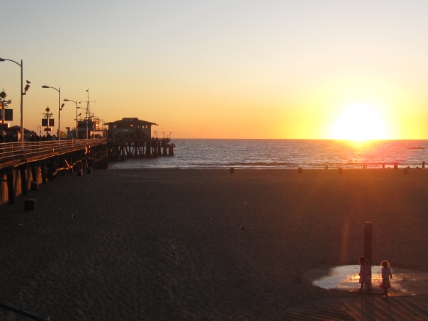 Two small children can be seen playing by outside shower near the pier as sun sits on water horizon.