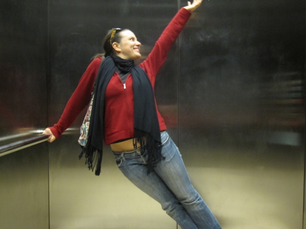 A pretty lady in winter clothing doing a ballet pose in an elevator.