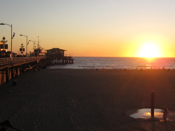 The pier and beach grow dark as the sun sets in the distant horizon.