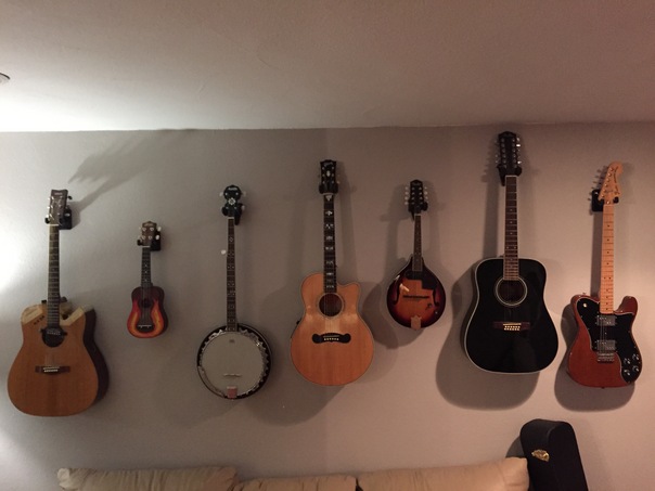 This guitar teacher has a large collection of stringed instruments hanging on the wall.
