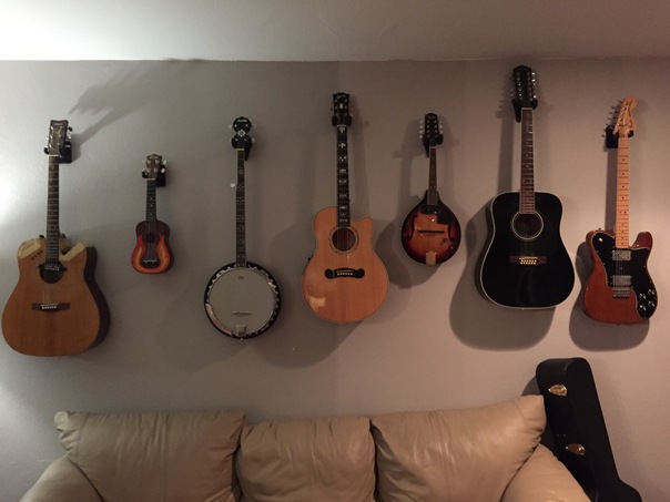 A variety of guitars, banjos, ukuleles, and mandolins hang on a white wall above a sofa.